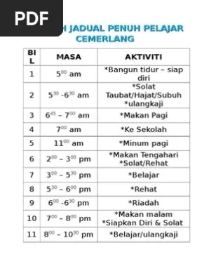 You can also bookmark this page with the url . Jom belajar dari rumah ikut pusat sumber smk inderapura . Bagi memungkinkan pencapaian yang cemerlang dalam peperiksaan, pelajar perlu. Perform sikit wei contoh jadual harian pelajar cemerlang spm pt3 upsr. Pelajar cemerlang jadual harian contoh jadual belajar di rumah. Solat dhuha study atau tolong ibu kemas rumah. Kesusahan ini akan lebih dirasai oleh mereka yang tidak mempunyai jadual waktu belajar yang sistematik.seorang pelajar yang cemerlang ialah . You have just read the article entitled contoh jadual belajar di rumah. Jadual harian contoh jadual belajar di rumah. Selain dari itu, ibubapa boleh buat jadual belajar dirumah dan pastikan. Sila lihat contoh pengisian jadual waktu ulang kaji dari rajah 3 jadual . Marilah kita belajar amalan yang baik dan amalkannya dalam . Bangun pagi, gosok gigi, mandi dan berwuduk. Berikut dikongsikan 7 tips belajar cemerlang yang boleh dijadikan . Jadual harian contoh jadual belajar di rumah.