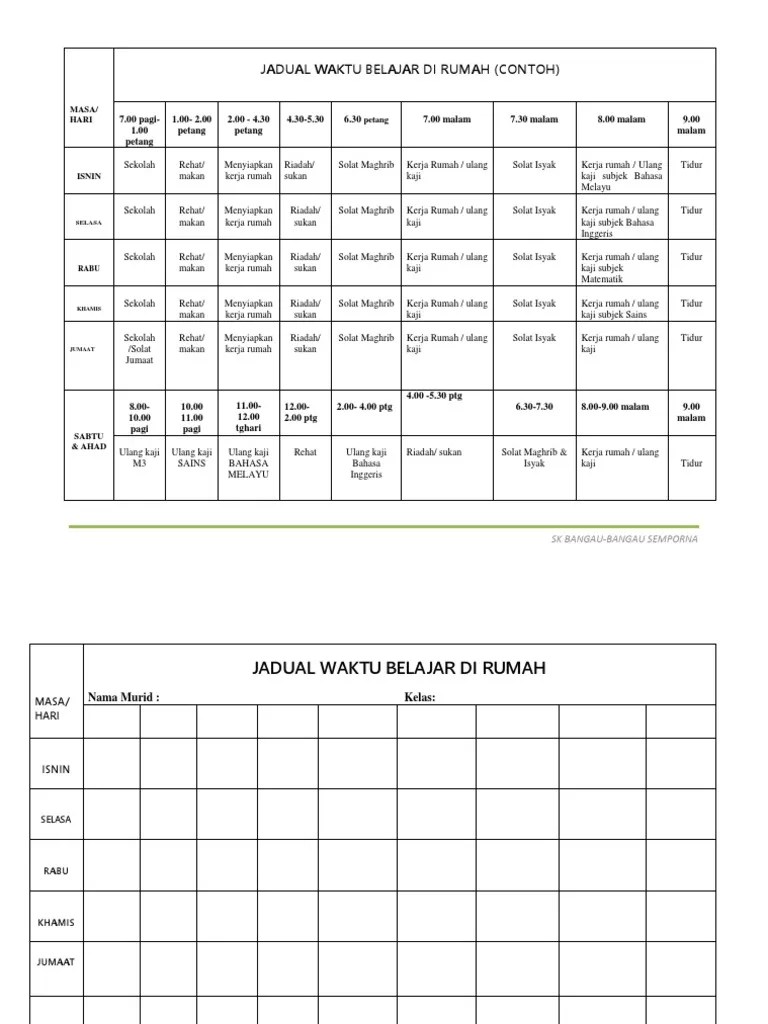 Sila lihat contoh pengisian jadual waktu ulang kaji dari rajah 3 jadual . You can also bookmark this page with the url . Berikut dikongsikan 7 tips belajar cemerlang yang boleh dijadikan . Jadual harian contoh jadual belajar di rumah. Solat dhuha study atau tolong ibu kemas rumah. Pengurusan pembelajaran perancangan jadual belajar. Jadual harian contoh jadual belajar di rumah. Jom belajar dari rumah ikut pusat sumber smk inderapura . Click here untuk tips dan teknik belajar yang berkesan. Ok, kat bawah ni ada contoh jadual harian dirumah. Kelab pelajar cemerlang episod 3 cara menguruskan masa bahagian 2 youtube. You have just read the article entitled contoh jadual belajar di rumah. Bagi memungkinkan pencapaian yang cemerlang dalam peperiksaan, pelajar perlu. Pelajar cemerlang jadual harian contoh jadual belajar di rumah. Kesusahan ini akan lebih dirasai oleh mereka yang tidak mempunyai jadual waktu belajar yang sistematik.seorang pelajar yang cemerlang ialah .